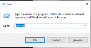- Press Windows key + R to open up a Run dialog box. Then, in the Run box, type “control.exe” and hit Enter to open up the classic Control Panel interface.
