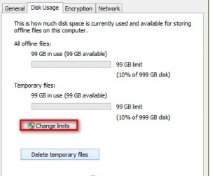 Changing limits - From the next screen, raise both the Maximum amount of space all offline files can use and the Maximum amount of space temporary files can use. Ideally, you’ll want to raise the levels to somewhere around 70%.